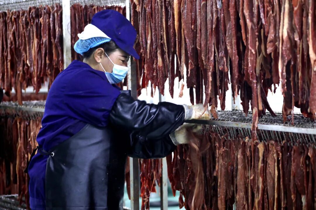图为当地群众在西藏五齐食品加工有限公司里晾晒牛肉干。
