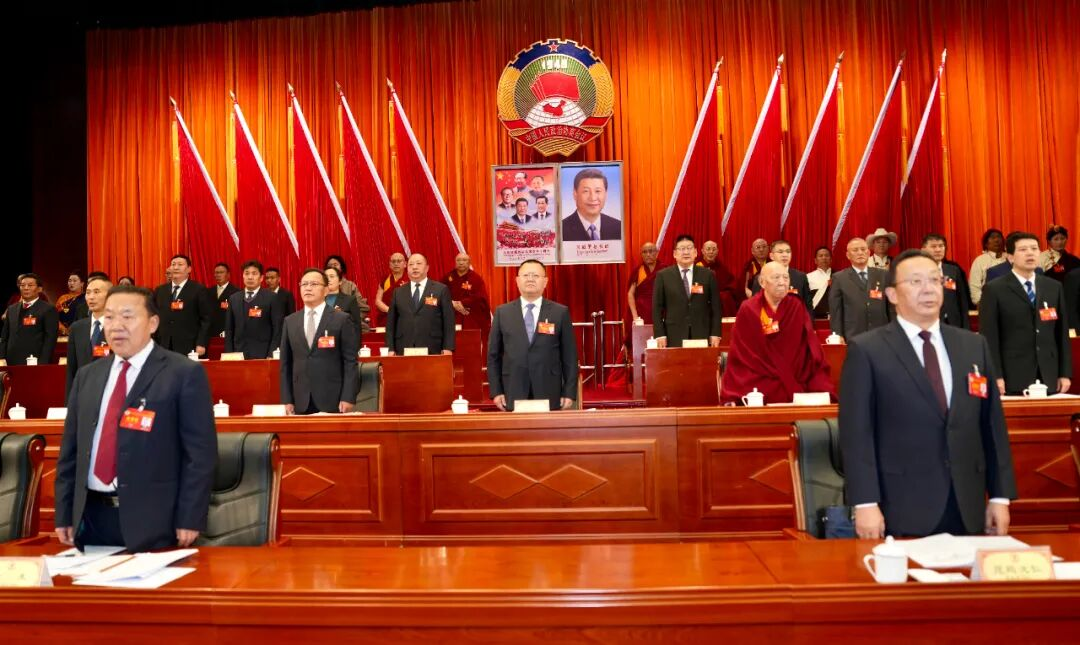 康巴文化演艺推介中心报告厅内气氛庄严,象征全国各族人民大团结的政协会徽悬挂在主席台正中,十面红旗分列两侧。