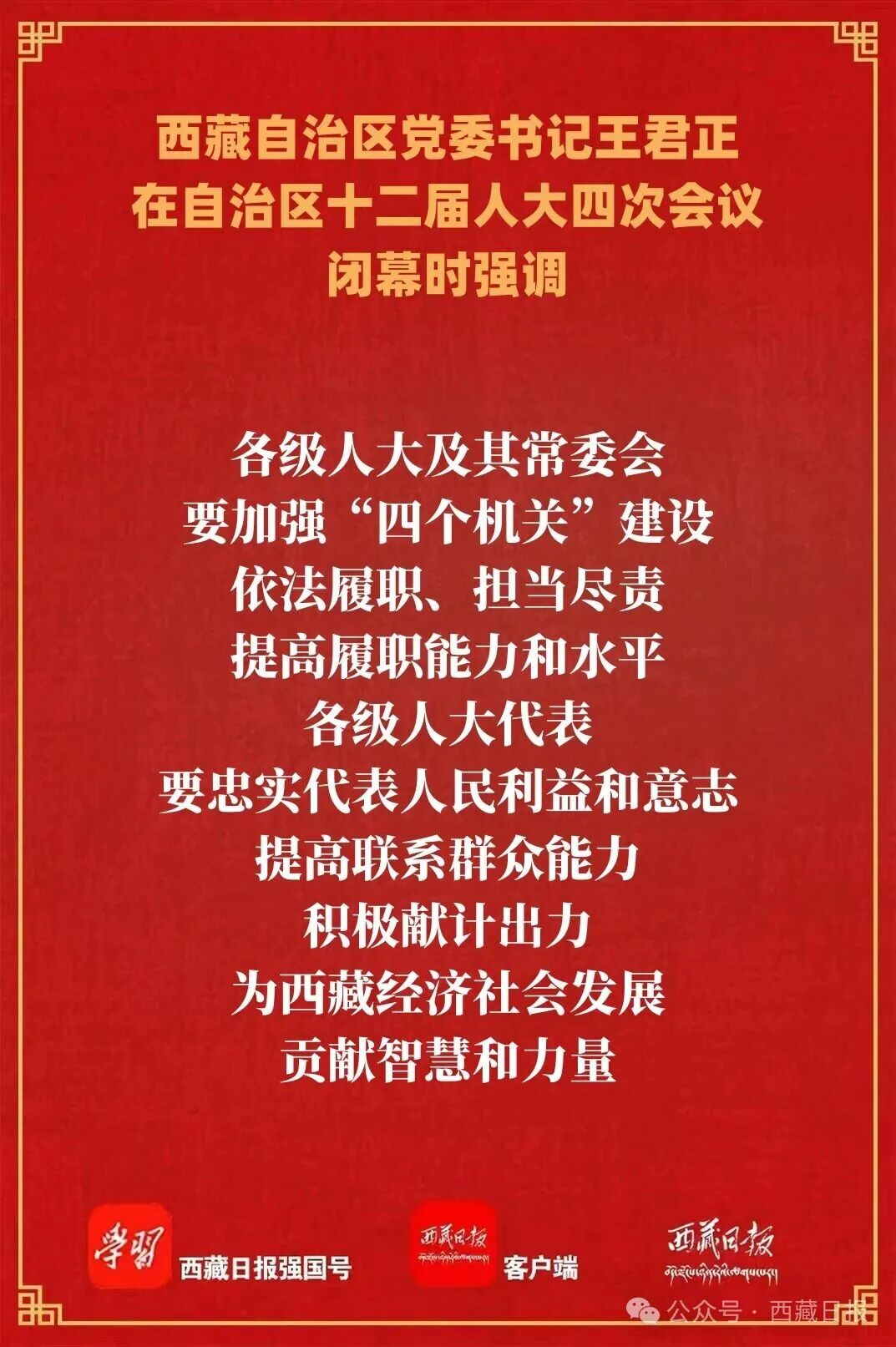 王君正指出,自治区十二届人大四次会议是一次实干兴藏、奋战开局、共谋新篇的大会。会议审议通过的“十五五”时期西藏自治区国民经济和社会发展规划纲要,深入贯彻了党的二十届四中全会精神,全面贯彻了习近平总书记关于西藏工作的重要指示和新时代党的治藏方略,把习近平总书记为西藏擘画的宏伟蓝图细化为“十五五”时期的具体目标任务,实化为确保“十五五”开好局起好步的各项工作举措,充分彰显了中国特色社会主义制度优势,集中体现了全区各族人民对美好生活的期盼向往,吹响了启航“十五五”、迈向新征程的奋斗号角。全区各级各部门和广大干部要深刻领悟“两个确立”的决定性意义,增强“四个意识”、坚定“四个自信”、做到“两个维护”,按照本次会议确定的目标任务,以高度的政治责任感和强烈的历史使命感,扎实围绕“四件大事”落实,推动长治久安和高质量发展,真正把宏伟蓝图变为美好现实。